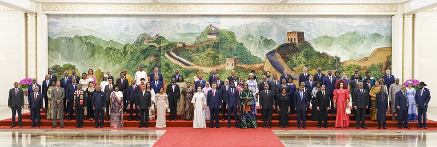 9月4日晚,國家主席習近平和夫人彭麗媛在北京人民大會堂舉行宴會,歡迎來華出席中非合作論壇北京峰會的非方及國際貴賓。這是宴會前,習近平和彭麗媛同貴賓們集體合影留念。
